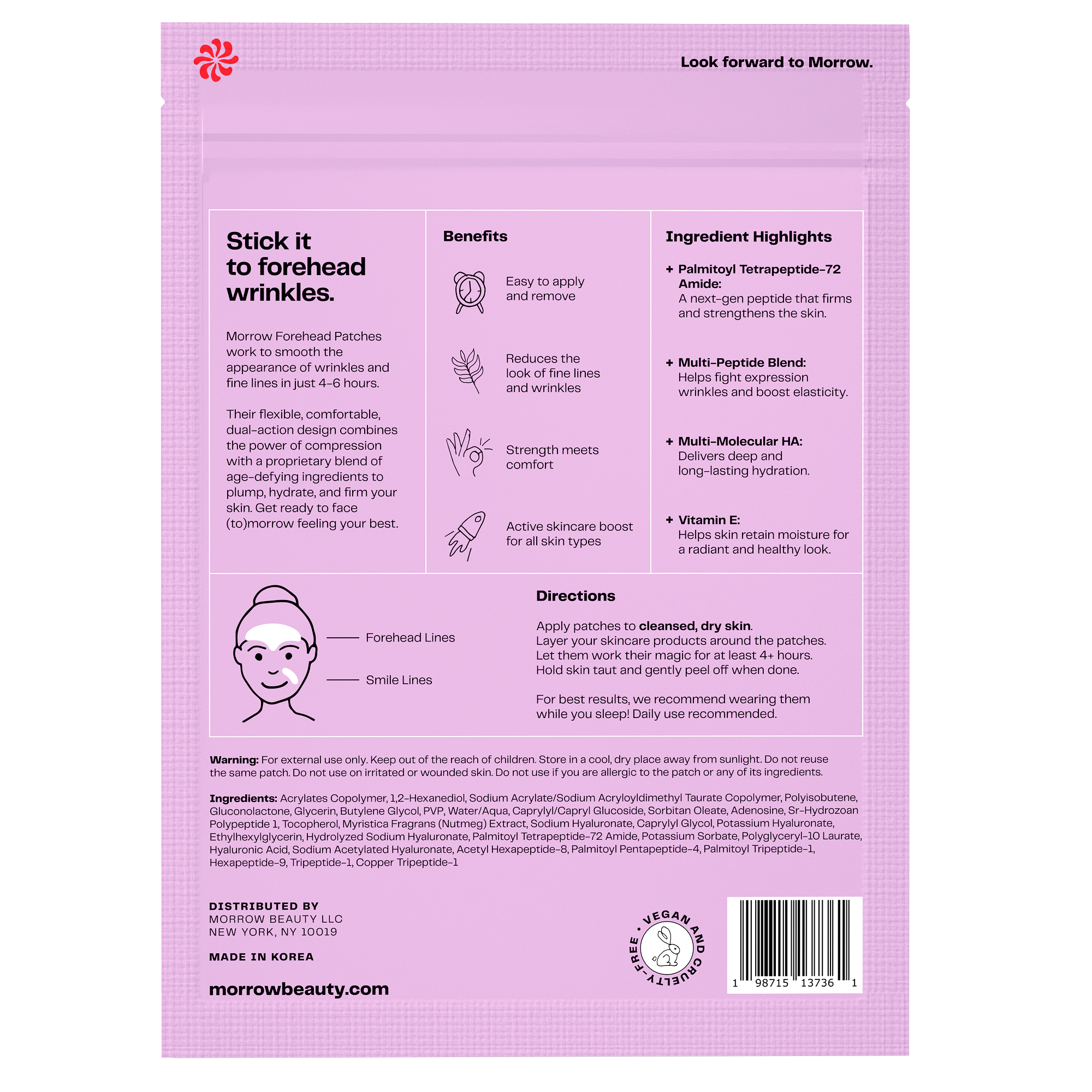 Morrow patches contain a proprietary blend of anti-aging and hydrating ingredients that actively smooth, plump and moisturize the skin.